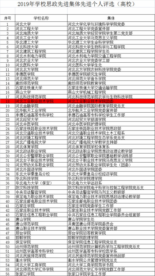 近日,中共河北省委教育工委、河北省教育厅下发了《关于2019年河北省学校思想政治教育先进集体和先进工作者候选名单公示的通知》,我院团委荣获2019年“河北省学校思想政治教育先进集体”荣誉称号。