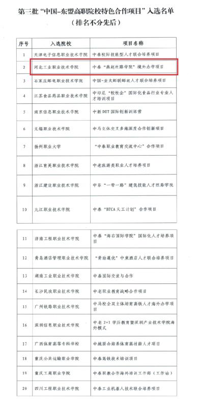日前,中国教育国际交流协会秘书处(教育部直属单位)公布了第三批“中国-东盟高职院校特色合作项目”,我校申报的“中泰‘燕赵丝路学院’境外办学项目”成功入选。