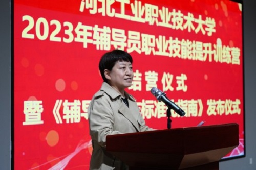 结营仪式上,党委副书记付俊薇、院系书记代表以及辅导员代表共同按下象征发布的按钮,我校《辅导员工作标准化指南》正式发布。付俊薇在仪式上讲话,她首先肯定了本次训练营取得的成效,指出《辅导员工作标准化指南》的发布对于我校学生管理和思想政治工作具有重要意义。围绕学校思政工作和辅导员的个人成长,付俊薇向全体学工队伍提出了三点希望。一是要学习党的二十大精神,坚持立德树人,体现工职大学工人的家国情怀。二是要深入调查研究,直面工作的痛点难点,体现工职大学工人的工匠精神。三是要凝练经验做法,进行项目化研究,体现工职大学工人的职业素养。