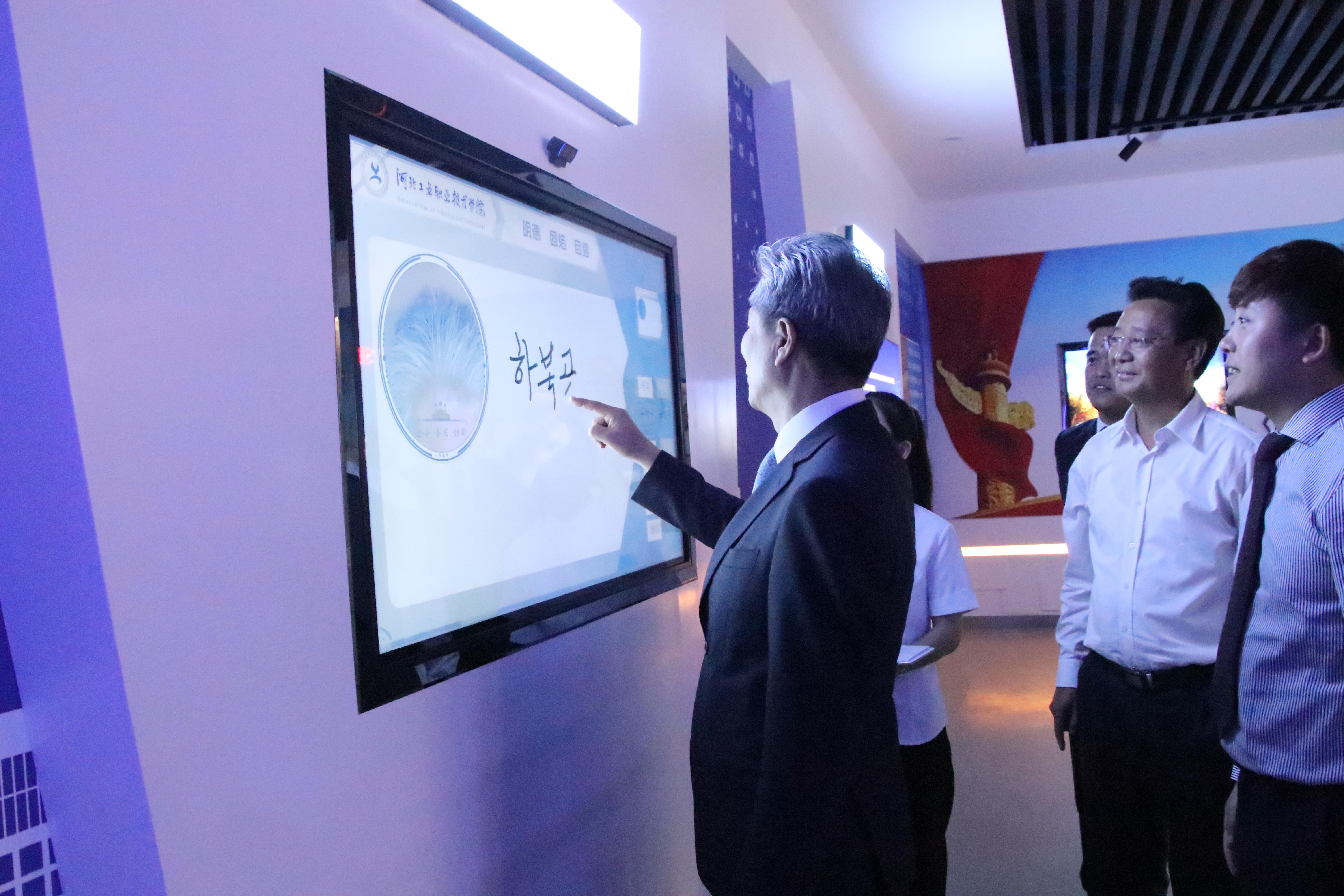 贾俊礼院长陪同客人参观了图书馆、校史馆、铁板浮雕艺术工作室。韩国客人对我院图书馆和校史馆的现代化、信息化水平表示赞赏,对铁板浮雕非遗艺术的文化魅力赞叹不已。