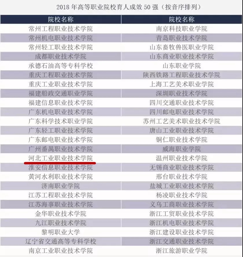 《中国高等职业教育质量年度报告》已经连续发布八年,2019年度报告进一步完善了学生成长成才、学校办学实力、发展环境、国际影响力和服务贡献力构成的"五维质量观",并首次发布高等职业院校育人成效50强榜单,凸显了对高等职业教育立德树人的重视,引领高职院校切实提高育人质量。学院此次入选“育人成效50强”,是对我院“全员、全过程、全方位”育人工作成效的充分肯定。