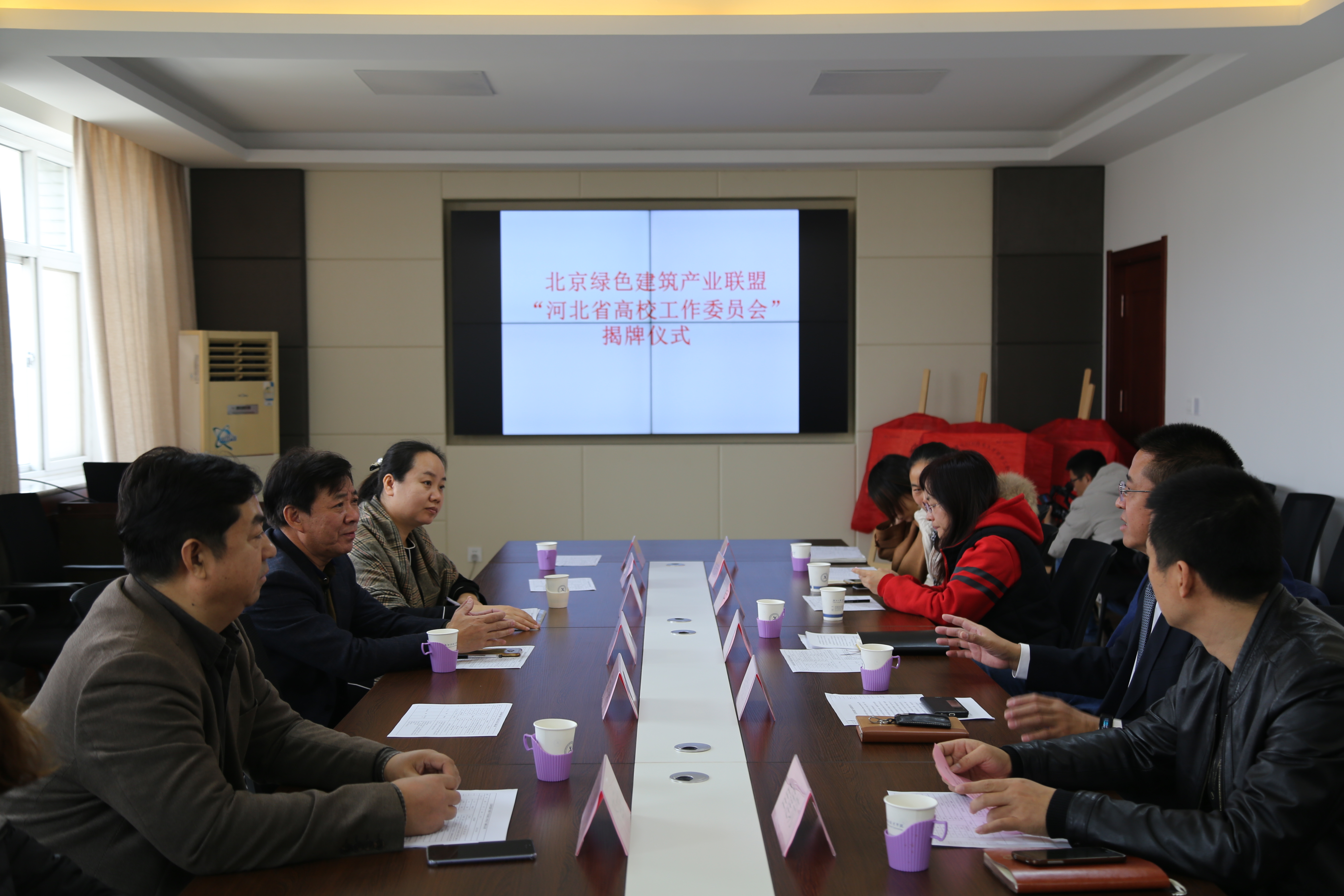 2018年11月13日,“北京绿色建筑产业联盟河北省高校工作委员会”揭牌仪式在我院举行。学院副院长韩提文、北京绿色建筑产业联盟执行理事长陆泽荣、副理事长线登洲、秘书长齐运全、建筑工程系负责人以及相关教师代表出席了揭牌仪式。