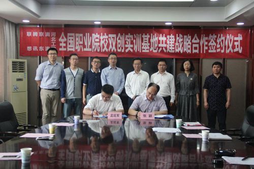 5月14日,我院与联想、腾讯、京东、滴滴四家业界龙头企业,举行全国职业院校双创实训基地共建校企合作战略合作协议签署仪式。职业教育装备专业委员会刘永家主任、联想集团鲁维总监、腾讯集团张利刚总监、滴滴集团张颖总监、京东集团吴樑总监、学院贾俊礼院长、招生就业处负责人、教务处负责人、计算机技术系负责人出席了本次签约仪式。
