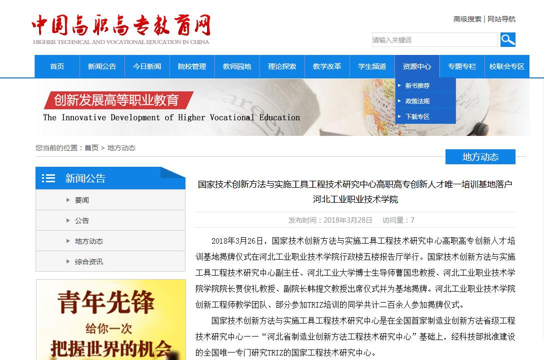 中国高职高专网报道国家技术创新方法与实施工具工程技术研究中心高职高专创新人才唯一培训基地落户我院。