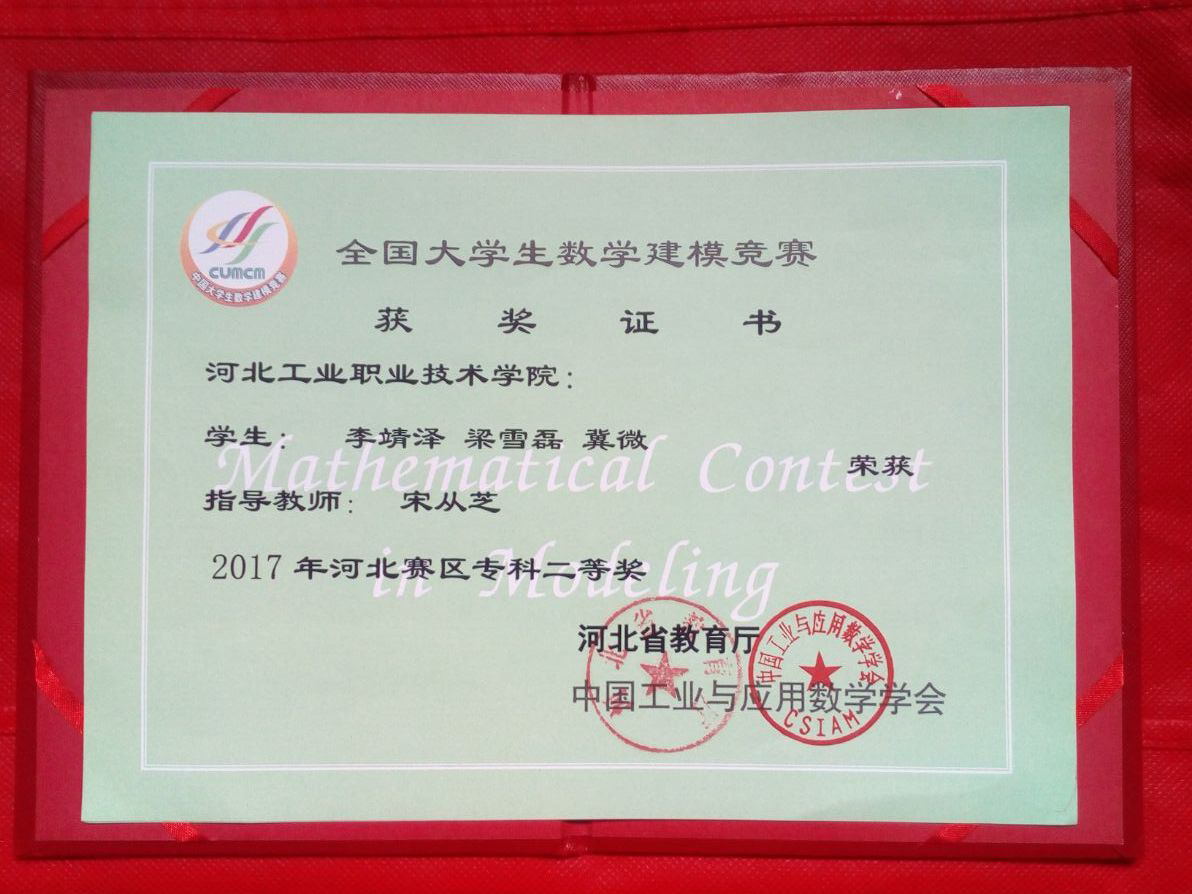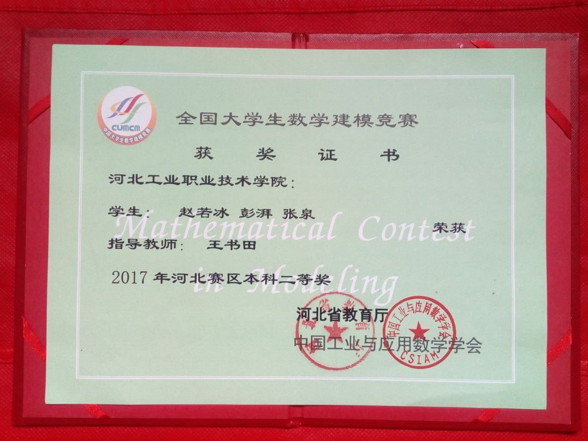 在2017年度全国大学生数学建模竞赛中,我院两个参赛队分别荣获河北赛区本科二等奖、专科二等奖的优异成绩,为学院争得了荣誉。