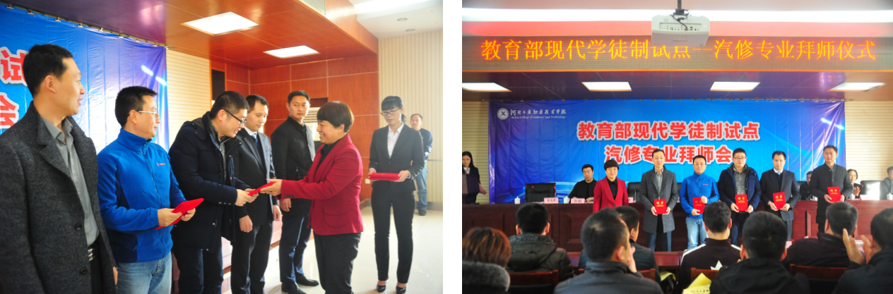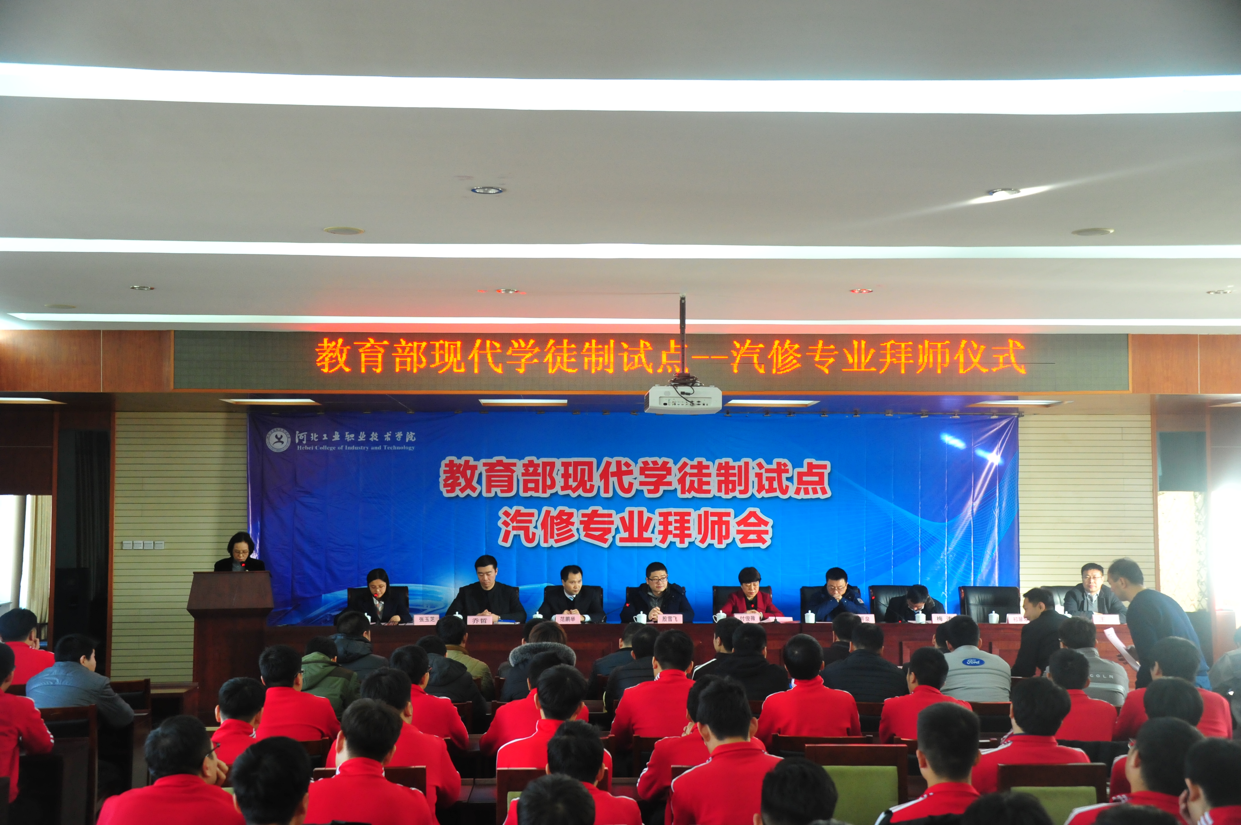 近日,教育部现代学徒制试点汽修专业拜师会在我院南校区举行。长安福特、上汽通、宝马、一汽奥迪等11家企业专家团队、16名企业师傅、学院汽修专业教师、学徒参加拜师仪式。