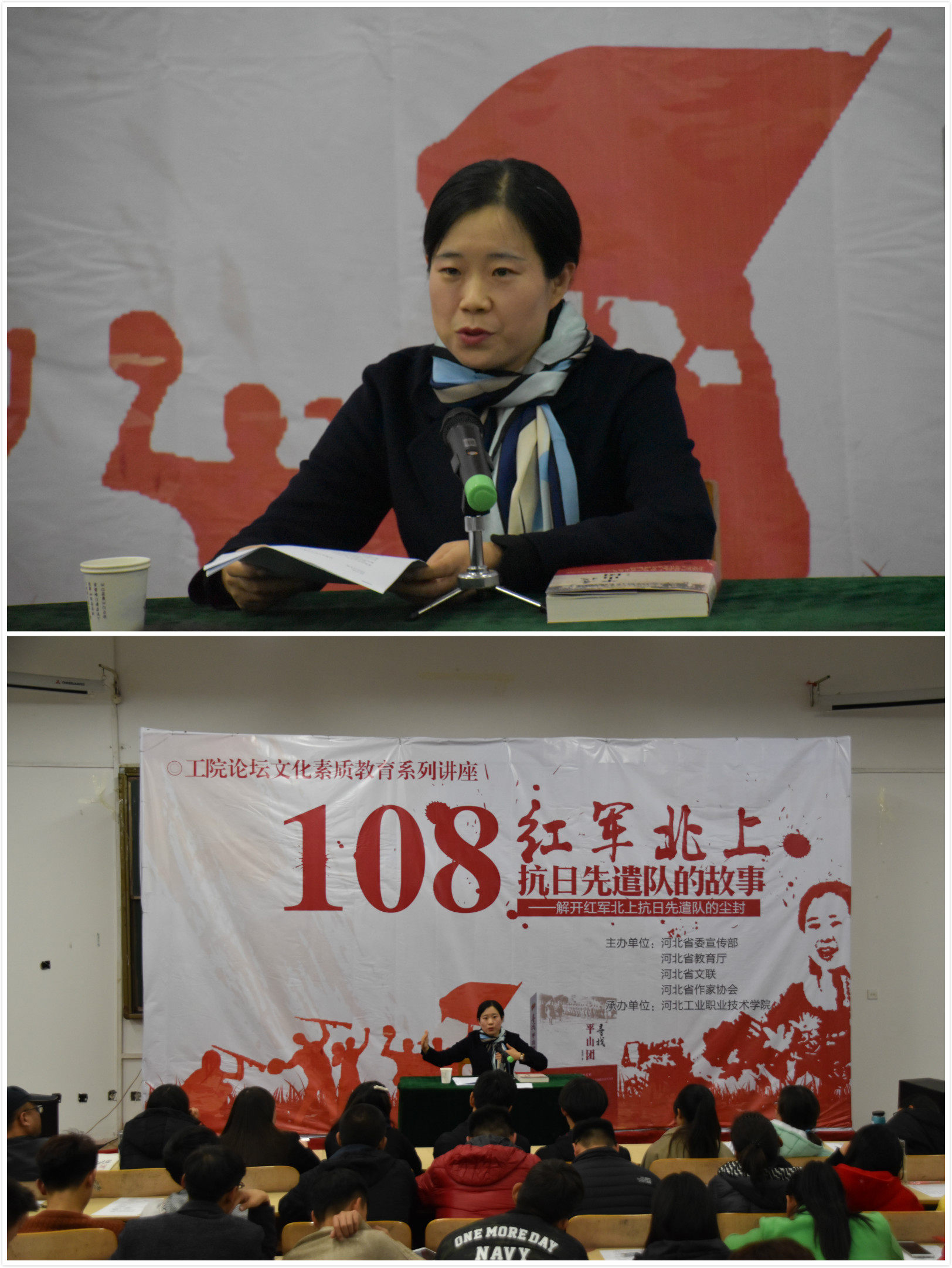 为了深入贯彻习近平总书记《在纪念长征胜利80周年大会上的讲话》精神,11月8日,工院论坛之“108—红军北上抗日先遣队的故事”主题讲座在3119如期举行。《太行文学》副主编,石家庄市作协副主席程雪莉老师为我们带来一场别开生面的讲座。程老师从燕赵大地古中山国的历史讲起,通过“太行山上铁的子弟兵”“第一次杀鬼子”“梅花镇惨案”“砸盐店”“南泥湾传奇”“万里征人魂归还”“俺还叫王家川”等故事,讲述了寻找108支队背后震撼人心的故事。程老师的讲述时而婉转,时而激扬,她用一位女人细腻的眼光和生动的描述,把同学们带回到了70年前的岁月。她还讲述了白求恩与平山团的渊源、中共中央选择西柏坡的历史偶然性和必然性等问题。