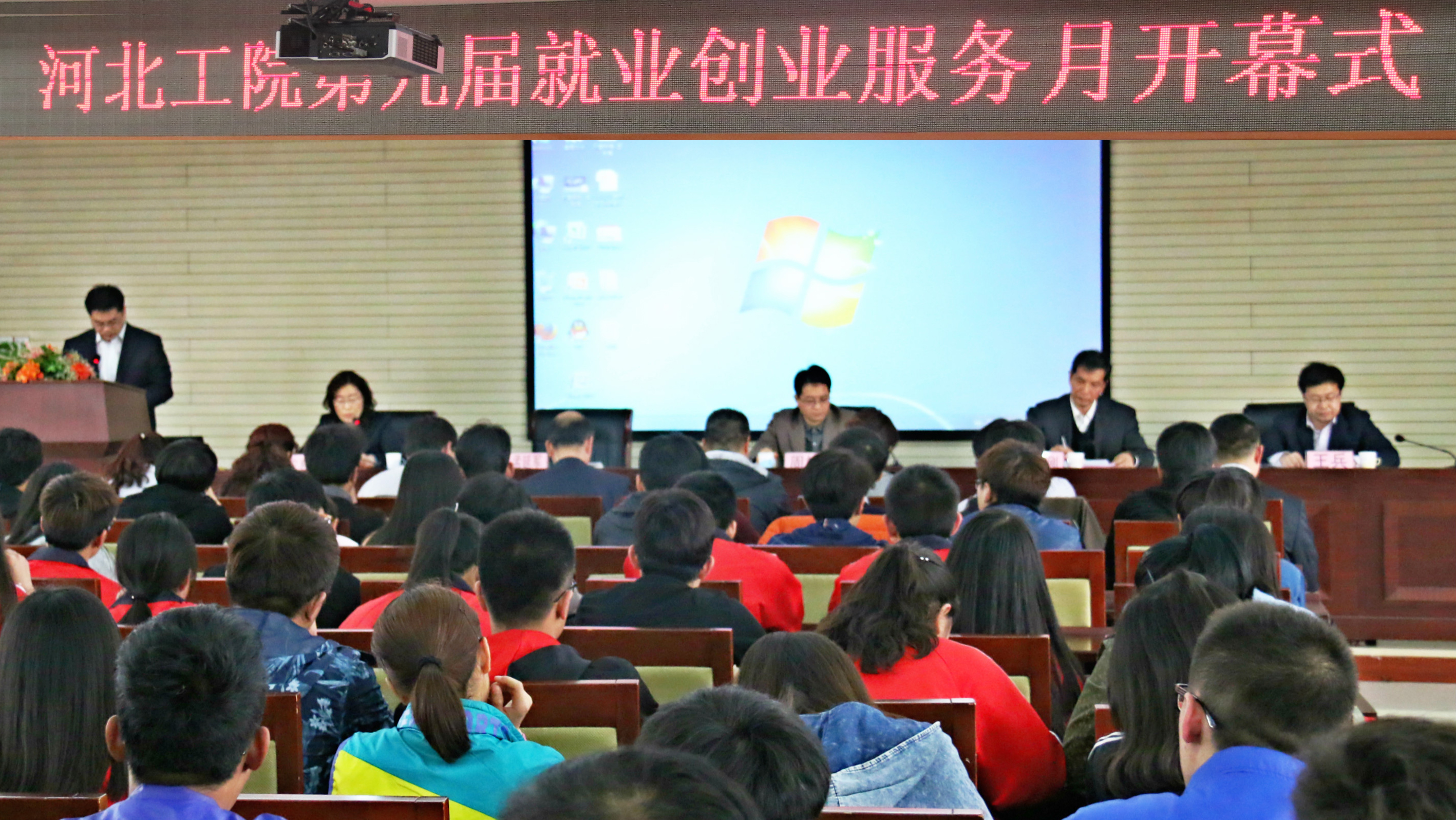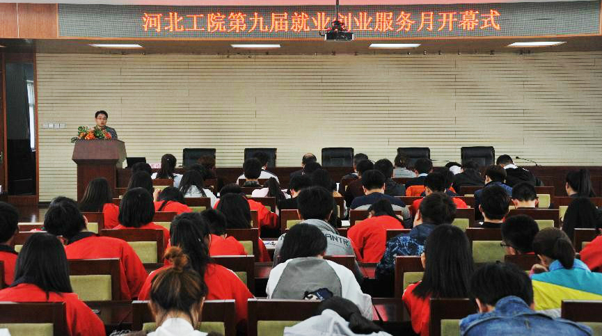 3月31日下午4:00招生就业指导中心在五楼报告厅举办了“河北工院第九届就业创业服务月”系列活动开幕式。省教育厅就业指导中心副主任周锋、学院党委副书记王建刚、招生就业指导中心和各系主管就业创业负责人、就业创业指导教师和学生代表出席开幕式。