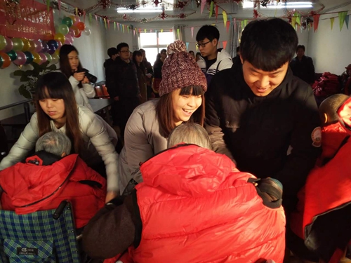 早在今年的重阳节,该班的同学们一起到石家庄福凯敬老院进行慰问,虽然敬老院的老人们的脸上挂着笑容,但是同学们还是能够感受到他们的孤独和思念家人的心情。志愿者李石佳回忆:“敬老院的老人们总是喜欢到院子里看着天空,回忆着往事,他们好像很腼腆,不爱主动和人说话,但是喜欢冲我们笑,更喜欢听我们说,所以我们决定要经常来看他们,和他们聊聊天,送上一件红马甲,让他们感受到我们带来的温暖,也许我们的力量是很微弱的,但是我们还是想要用我们的热情融化他们内心的寒冬”。