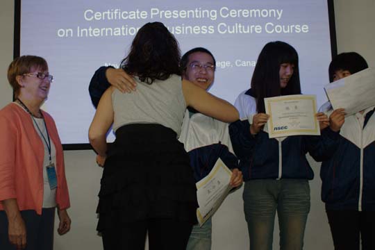 5月21日上午,参加加拿大斯高莎社区学院“国际商务文化”课程的45名学生怀着既喜悦又难舍离别之意,来到学院北校区实训楼301教室,他们将在这里高兴地接受加方授予的“国际商务文化”课程结业证书。证书授予完毕后,加拿大客人将与我院师生依依惜别,踏上归程。