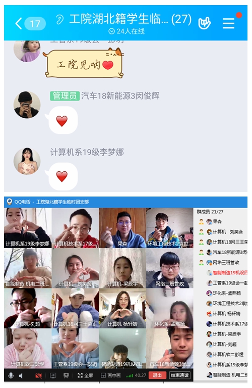 团课结束,临时团支部的师生依旧心潮澎湃,纷纷举手比心,相约团聚工院的一天。下一步,我院湖北籍学生临时团支部也将继续发挥团组织堡垒作用,以团支部为依托进行思想引领,围绕特殊时期团支部建设开展主题分享、打卡接力等团日活动,积极传播青春正能量,展示青年学生担当作为、共克时艰的良好风貌,将“组织育人”进行下去。