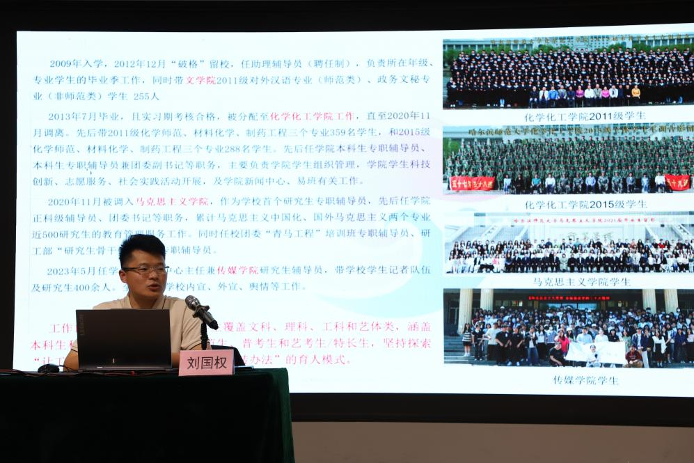 培训中,刘国权直面当下辅导员工作的挑战,介绍了辅导员职业发展的新机遇。围绕提升育人质效,刘老师提出关键在于思维革新、话语更新、方法创新。思维革新上,高校辅导员要思考思想教育与日常事务融合等问题,以知心朋友的方式成为学生的人生导师,在“感动”的基础上感染、感化、感召学生;话语更新方面,高校辅导员要掌握思政话语,熟悉青年话语,实现“双向奔赴”;方法创新层面,高校辅导员可以积极探索、提炼总结多样化的育人方法。此外,刘老师还总结了优秀高校辅导员的“人本、影响、理念、创新、开放、热爱”六大关键词,强调站位、育人、思考、视野、工作等方面应具备的特质。